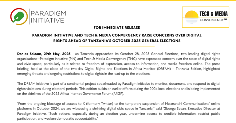 Dar es Salaam, 29th May, 2025 – As Tanzania approaches its October 28, 2025 General Elections, two leading digital rights organisations—Paradigm Initiative (PIN) and Tech & Media Convergency (TMC) have expressed concern over the state of digital rights and civic space, particularly as it relates to freedom of expression, access to information, and media freedom online. The press briefing, held at the close of the two-day Digital Rights and Elections in Africa Monitor (DREAM) – Tanzania Edition, highlighted emerging threats and ongoing restrictions to digital rights in the lead-up to the elections.